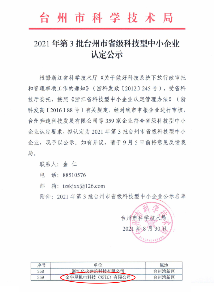 金宇星臺州灣新廠入選2021年第3批臺州市省級科技型中小企業(yè)名單